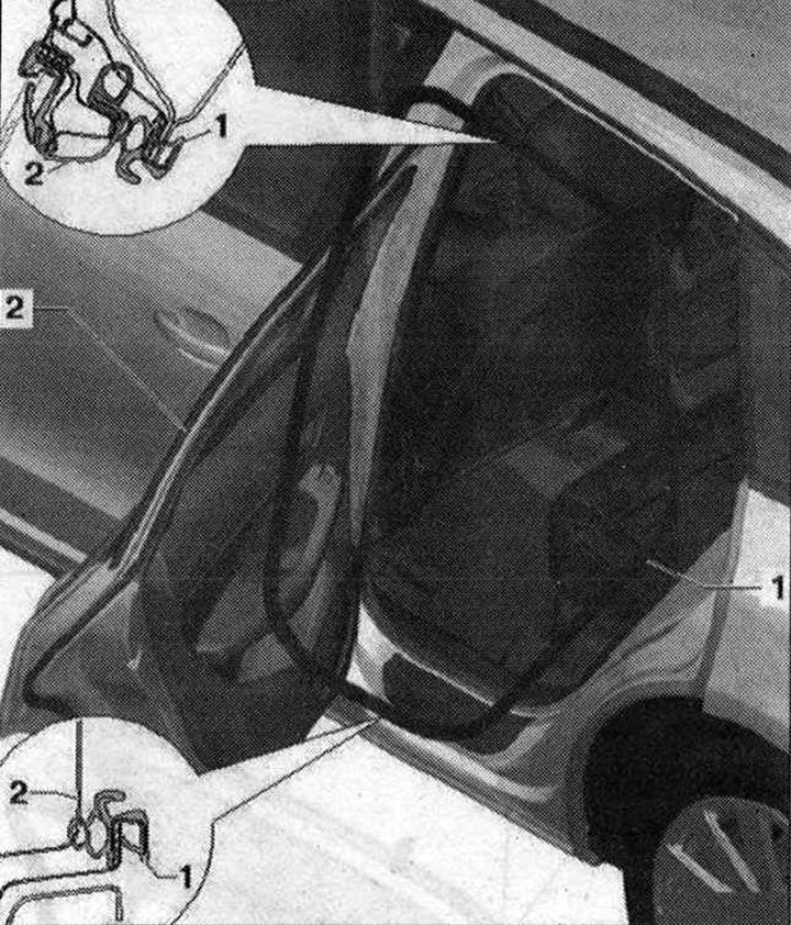 - 1. Внешний уплотнитель двери. Положение уплотнения перед снятием отметить на двери, например, изолентой. Для того чтобы по возможности остатки клея не остались на двери, следует тянуть уплотнение только в продольном направлении и лишь после этого снимать с двери. Оттянуть немного уплотнение сверху с двери и перерезать обычными ножницами. Снятие: тянуть уплотнение только в продольном направлении, затем постепенно снимать вверх. Монтаж: почистить места склейки очистителем «D 009 401 04», при необходимости удалить остатки клея инструментом для удаления клеевых полос «VAS 6349». Нанести усилитель сцепления «D 355 205 А2» с аппликатором «D 009 500 25» в области склеивания и дать высохнуть в течение 10 минут. Отсоединить ограничитель открывания двери на кузове. Извлечь наружное уплотнение двери за ограничителем открывания двери. Заново закрепить фиксатор двери. Зафиксировать наружный уплотнитель двери на оконной раме слева и справа снаружи изолентой. Для правильного положения отверстия водоотвода (2х) должны находиться в наружный уплотнитель двери в нижней части. С обеих сторон последовательно вдавить наружный уплотнитель двери, начиная с середины. Снять защитную пленку с нижней части двери. Вдавить наружный уп-лотнитель двери по центру нижней части влево и вправо. Далее постепенно снимать защитную пленку и прижимать наружное уплотнение двери. Затем вдавить уплотнитель двери вверх вдоль стоек А и В. Затем вдавить уплотнитель двери вверх вдоль рамы окна. При установке нельзя растягивать или сплющивать уплотнение двери. Любое растягивание или сплющивание уплотнителя с нижней стороны или на стойках А и В может привести к его отслоению. Уплотнение двери можно растягивать или сплющивать тальков верхней области рамы окна, поскольку здесь обеспечивается прочная посадка над накладкой рамы. Прижать основание уплотнителя двери роликом для прикатки изолирующей пленки «3356». Чтобы наружный уплотнитель двери не сместился и не выпал, дверь не закрывать в течение 2 часов, при этом а/м должен быть температуры помещения