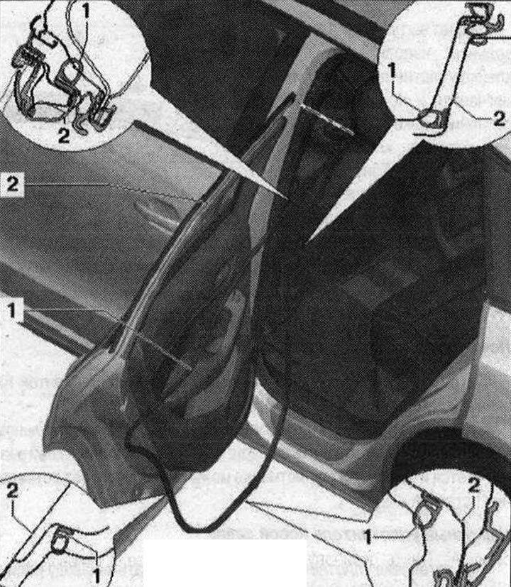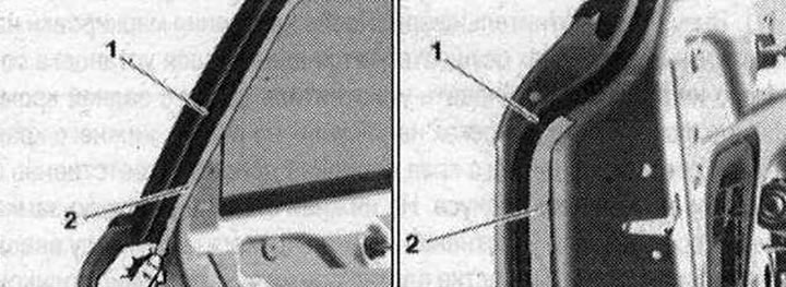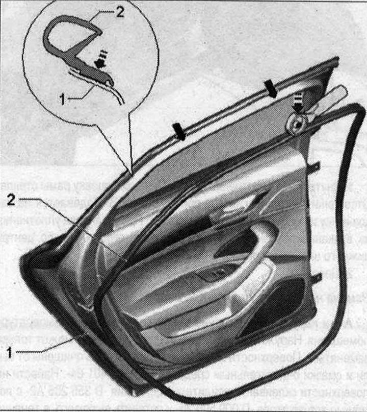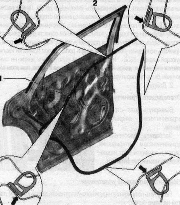 Снятие внутреннего уплотнения двери 1. Внутреннее уплотнение двери. Снять облицовку рамы стекла. Отсоединить ограничитель двери от стойки В. Надевается на закраину кузова. Снять с закраины кузова. При установке уплотнения из вулканизированной резины выровнять его стыком по центру нижнего шарнира и прижать рукой к фланцу кузова.; 2. Дверь