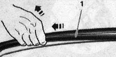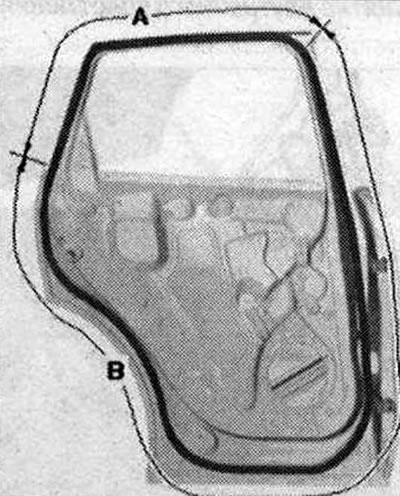 В зоне «А» передняя кромка уплотнения, начиная примерно от прижимной планки, далее по раме окна до "стойки В", необходимо насадить и прижать, как показано на рис., по внешнему радиусу. На участке «В» задний край уплотнения следует установить на выходе внутреннего радиуса.