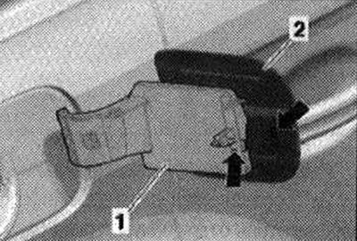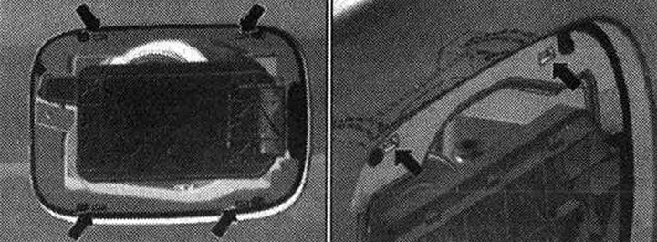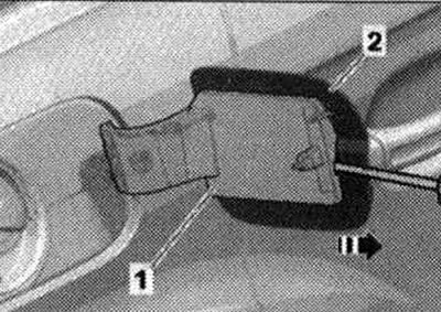Вставить отвертку согласно рисунку между люком «2» и гнездом крепления люка «1» и освободить фиксатор. Немного потянуть люк назад «стрелка» из фиксатора. Снять люк.