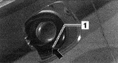 Элемент аварийного открывания лючка бензобака 1. Электродвигатель открывания лючка бензобака «V155»; 2. Тросовая тяга для аварийного открывания. Установить электродвигатель открывания лючка бензобака «V155» вместе с тросом поверх ниши лючка бензобака, как показано на рисунке. Провести тросовую тягу в салон по направлению назад и установить на выступ на фланце центрального блока управления системы Комфорт «J393»; 3. Боковина