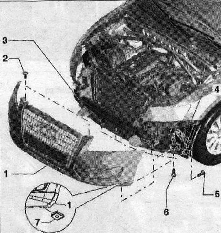 Облицовка бампера 1 .Облицовка бампера. Обращать внимание на различие в исполнении. Перед лакокрасочными работами и установкой "S-line" бампера следует удалить только транспортировочную перемычку. В отдельных вариантах боковины бампера можно менять по отдельности. Снятие: перед снятием снять верхнюю накладку рамки радиатора. Выкрутить верхние болты «2», а также болты «6» запирающего механизма снизу. Отсоединить подкрылок в зоне болтов «5», отжать назад и выкрутить болты «5». Отсоединить накладку из крепления у перехода к крылу сбоку. Немного оттянуть накладку вперёд и отсоединить разъёмы к противотуманным фарам и, при наличии, к датчикам парктроника. При необходимости отсоединить кабель к омывателю фар. Снять накладку вперед; 2. Болт. 4 Н·м; 3. Шумоизолирующий кожух; 4. Крепление крыла. При установки накладки бампера она должна зафиксироваться между кронштейном и крылом; 5. Болт. 2,5 Н·м; 6. Болт. 5 Н·м; 7. Скобка