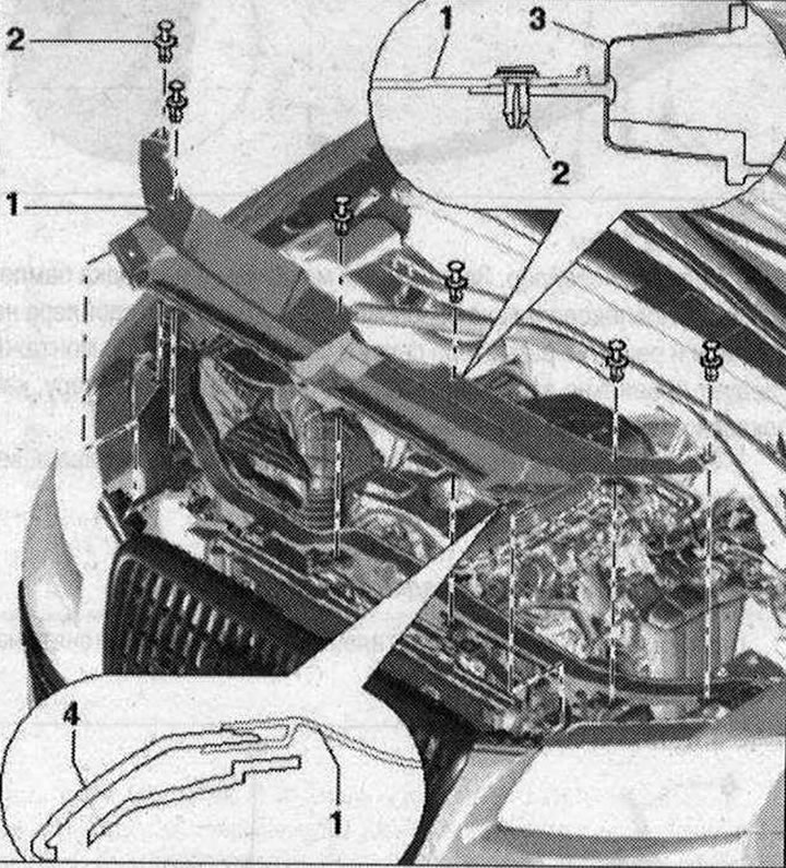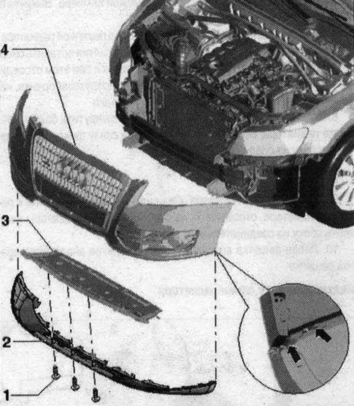 1. Облицовка замыкающей панели. Снятие: Для снятия выкрутить фиксирующие штифты клипсы. Извлечь зажимы из облицовки. Приподнять сзади накладку и снять с фальшрадиаторной решётки. Установка: Надвинуть накладку на фальшрадиаторную решётку, вставить клипсы и вжать до упора болты; 2. Распорный пистон; 3. Рамка радиатора; 4. Решетка радиатораРегулировка облицовки переднего бампера