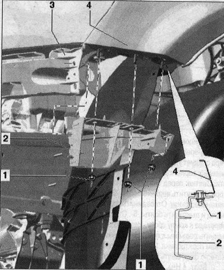 1. Гайка. 4 Н·м; 2. Опорное крепление. Снять облицовочную панель переднего бампера. Открутить гайки «1» и снять передний кронштейн; 3. Крепление фары; 4. КрылоСнятие решетки воздухозаборника