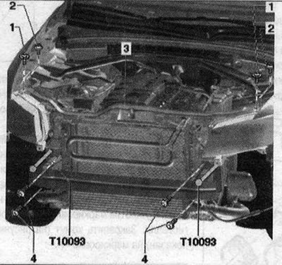 3. Рамка радиатора. Сервисное положение: На а/м с адаптивным круиз-контролем (АСС) дополнительно учитывать следующее: если бампер был снят и устанавливается вновь или проведены изменения на держателе "АСС", то необходима юстировка адаптивного круиз-контроля. Отсоединить клеммы АКБ. Снять передний бампер. Снять верхнюю обшивку рамки радиатора. Выкрутить болты под шумоизоляцией бампера. Выкрутить болты стойки замыкающей панели. Отсоединить трос в оболочке капота в точке крепления. Выкрутить болты уравнительного бачка ОЖ. Извлечь расшир. бачок из держателя движением вверх. Отсоединить штекерные разъемы фар. На а/м с интеркулером дополнительно отсоединить напорные шланги. Отвернуть нижние болты справа и слева от лонжерона. Ввернуть направляющие стержни «Т10093» слева и справа снаружи в свободные резьбовые отверстия. Вывернуть остальные болты.
