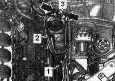 Переместить вперед рамку радиатора вместе с расширительным бачком, не растянув магистрали, на направляющие стержни. При установке рамки радиатора провода не должны быть сдавлены или зажаты. Установка в обратном порядке. После установки следует проверить регулировку фар и при необходимости отрегулировать фары