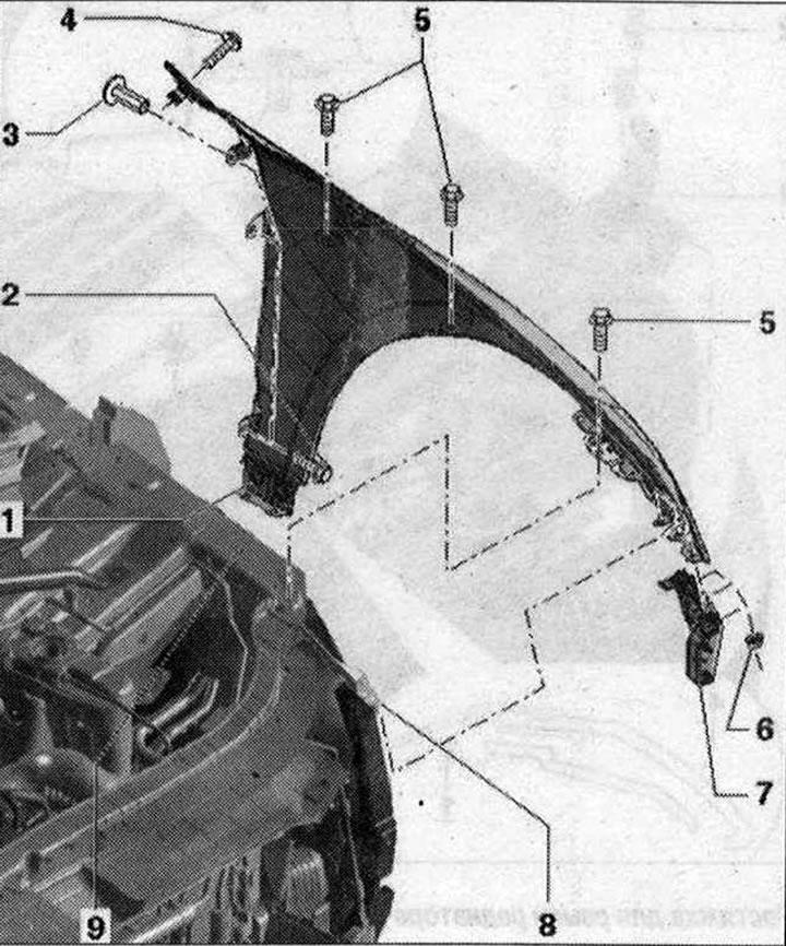 - 1. Крыло. Снятие: снять водосборный желоб. Снятие обшивки водоотводящего короба. Снять передний бампер. Снять фару. Снять подкрылок колесной арки. Снять торцовку крыла. Вывернуть болты «2»; «4» и гайки «7» и снять крылья. Установка: в обратной последовательности.