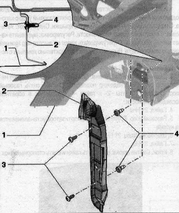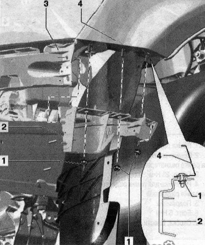 - 2. Торцовка крыла. Снять переднее колесо. Снять заднюю часть подкрылка. Отсоединить бачок омывателя на левой стороне. Вывернуть болты «3», разблокировать в заднем кронштейне крыла и извлечь торцевую часть по направлению вниз