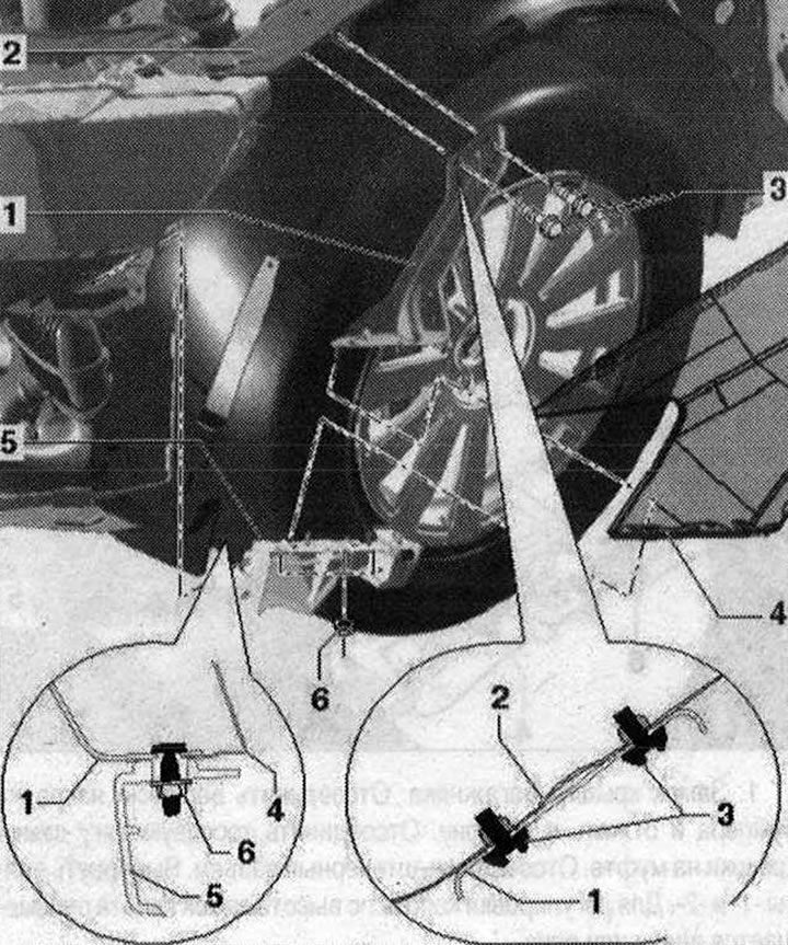 - 1. Растяжка. Снять бампер и отвести подкрылок в сторону в области растяжки. Для снятия вывернуть болты «2»