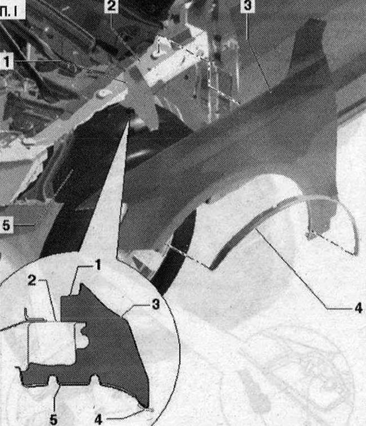 I 1. Прокладка. Самоклеящееся. Снять защитную пленку и установить уплотнение на кронштейн крыла под подкрылком, как показано на рисунке; 2. Кронштейн крыла. Установить уплотнение на кронштейн крыла между подкрылком и внутренней стороной крыла; 3. Крыло; 4. Накладка. Обращать внимание на различие в исполнении. Склеиваемые поверхности должны быть очищены от пыли и обезжирены. Снять защитную плёнку, надвинуть крышку и сильно прижать