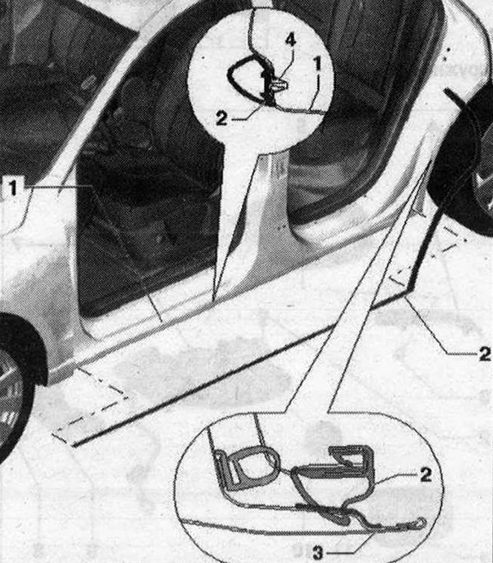 Уплотнение порога 1. Нижняя продольная балка; 2. Уплотнение порога. Для снятия стянуть уплотнение с порога из клипс, начиная спереди. Удалить клипсы из порога. Если повторно устанавливается старое уплотнение, то клипсы сперва необходимо вставить в уплотнение. Зафиксировать уплотнение, начиная спереди, и насадить у крыла на фланец кузова. Надвинуть у "стойки С" под уплотнение бокового стекла и зафиксировать в боковине; 3. Дверь; 4. Зажим. Вставить пистон в уплотнение перед установкой