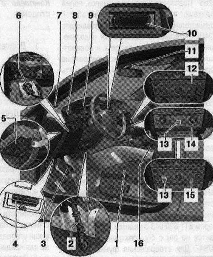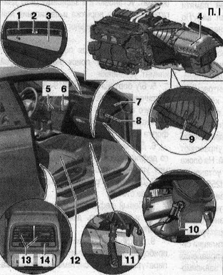 Комплекс "1" узлов и деталей с левой стороны 1. Левое сиденье (сиденье водителя) с деталями для обогрева и вентиляции обогрева сиденья (датчик температуры переднего левого сиденья «G344», обогреваемое переднее левое сиденье «Z45») и вентиляция сиденья (блок управления и разные вентиляторы). Обогрев и вентиляция сидений установлены не во всех а/м (дополнительная комплектация). Настройка обогрева и вентиляции сидений осуществляется на блоке управления и индикации климат, установки, блоке управления Climatronic «J255». Управление обогревом и вентиляцией сидений отображается в блоке измеренных значений панели управления и индикации климат, установки, блока управления Climatronic «J255». Управление обогревом и вентиляцией сидений осуществляется в зависимости от оснащения и исполнения а/м, через разные блоки управления (для «J519», «J136» и «J521», в зависимости от а/м). Если возникают условия, при которых обогрев или вентиляция сидений водителя или переднего пассажира не может быть включена, этот факт в форме ошибки сохраняется в блоке управления бортовой сети «J519», в блоке управления регулировки положения сиденья и рулевой колонки с функцией памяти «J136» или в блоке управления регулировки положения сиденья переднего пассажира с функцией памяти «J521» (зависит от модели и компл. а/м). По шине данных для такого а/м в настоящее время на блок управления и индикации, блок управления Climatronic «J255» не посылается информация, которая должна считываться из памяти неисправностей в соответствующем блоке управления или в центральном блоке управления системы комфорта «J393». Поэтому вначале, если появились рекламации к обогреву или вентиляции сидений, опростить память неисправностей блоков управления, которые управляют обогревом и вентиляцией сидений. На блоке управления и индикации климат, установки, блоке управления Climatronic «J255» устанавливается ступень обогрева и вентиляции сидений, эта настройка передается по системе шин данных на блок управления бортовой сети «J519». Заданные температуры для разных ступеней обогрева и вентиляции сидений записываются в блоке управления бортовой сети «J519». Поэтому в зависимости от исполнения «J519» и даты производства а/м при той же настройке на блоке управления и индикации климат, установки, блоке управления Climatronic «J255» заданная температура для обогрева и вентиляции сидений может быть разной (для «J519»); 2. Конденсатоотводчик слева (сторона водителя); 3. Дроссельная заслонка. Kick «Down-вы» ключение компрессора (через регулировочный клапан компрессора кондиционера «N₂80») происходит по запросу блока управления двигателем (данные передаются через систему шин данных). В блоке измеренных значений панели управления и индикации, блока управления Climatronic «J255», можно считать текущее состояние «N₂80» (климат. установки и в зависимости от двигателя системы впрыска и зажигания или системы предварительного накала и впрыска дизельных а/м); 4. Диагностическое подключение. Выполнить ведомый поиск неисправностей климат, установки; 5. Б/у бортовой сети «J519». Управление различными деталями, напр., обогревом заднего стекла «Z1» осуществляется через центральный блок управления системы комфорта «J393»; 6. Датчик температуры переднего левого дефлектора «G385» (только на а/м с климат. установкой исполнения "Komfort"); 7. Дефлектор размораживателя / левое боковое стек
