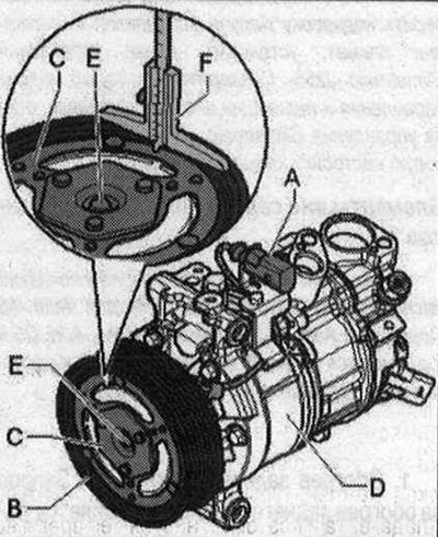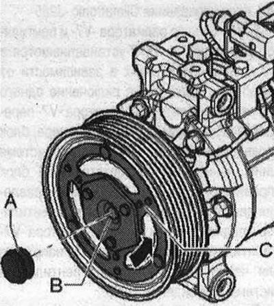 Крутящий момент привода компрессора передаётся на вал компрессора через болтовое соединение диска сцепления «С» на вале компрессора. Если при эксплуатации компрессора кондиционера диск сцепления «В» так сильно навернулся на вал компрессора, что снять его нельзя (шестигранный ключ на 7 «А» может не передать необходимый момент затяжки), нужно заменить компрессор.