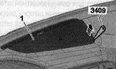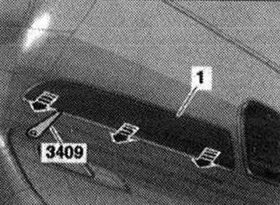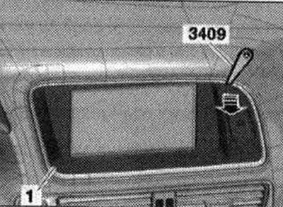 Приподнять накладку «1» дисплея ММИ клином «3409» за углы «стрелка» и снять ее. Отсоединить штекерный разъем контрольной лампы Airbag со стороны переднего пассажира выкл. «К145-/кла» виши включения аварийной световой сигнализации «Е229» и снять накладку.