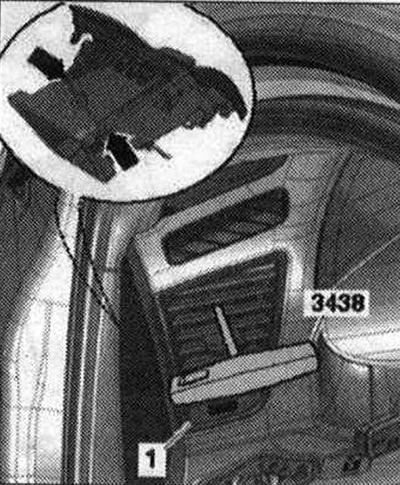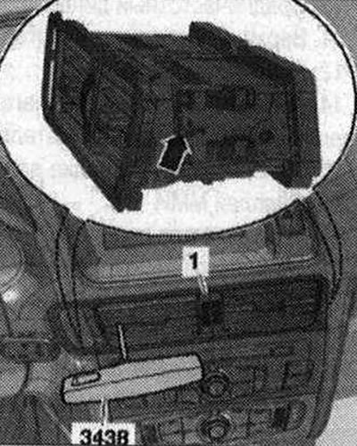На дефлекторе передней панели имеется с обеих сторон отверстие «стрелка» для установки съемника «3438». Дефлекторы передней панели «1» за обе стороны осторожно поочередно извлечь съемником «3438» из монтажного отверстия.