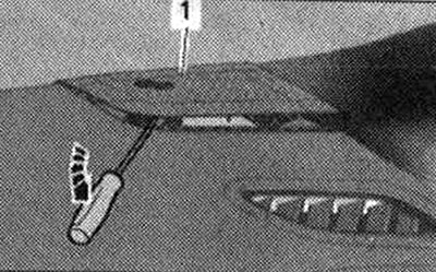 На дефлекторе передней панели сбоку и сверху имеются отверстия «стрелки» для установки съемника «3438». Дефлектор передней панели «1» сбоку и сверху поочередно осторожно извлечь съемником «3438» из монтажного отверстия.