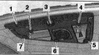 Снять накладку динамика в середине. Выкрутить винты «2...7» и снять верхний средний дефлектор размораживателя «1» назад с передней панели. Отсоединить электроразъем фотодатчика интенсивности солнечной радиации «G107».