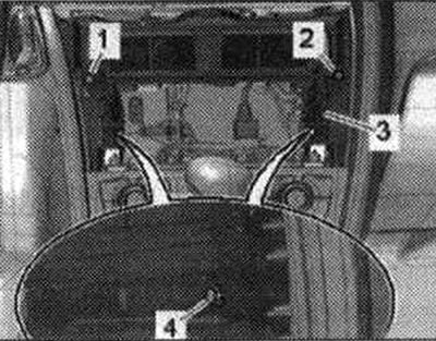 Снять дефлектор передней панели в середине. Снять магнитолу/навигационную систему. Вывернуть передние болты «1» и «2» крепления монтажной рамки. Вывернуть болт «4» сбоку. Потянуть монтажную рамку «3» по направлению назад и снять.