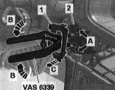 Снять дефлектор передней панели в середине. Провести клещи для демонтажа замка зажигания «VAS 6339» через клапаны накладки. Установить концы клещей для демонтажа замка зажигания «VAS 6339» в оба отверстия стрелка А- выключателя «2» управления доступом и правом запуска двигателя «Е415». Сжать их «VAS 6339» «стрелки В», что приведет к разведению концов клещей и разблокировке стопорных язычков накладки. Сжимайте 1 рукой «VAS 6339», а другой снимите накладку «1» «стрелка С».
