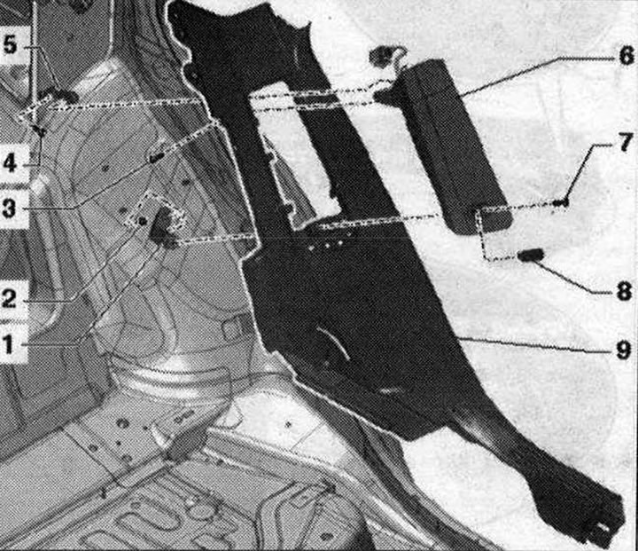 1. Кронштейн, нижний для боковой Airbag; 2. Гайка. 2 шт. 4,5 Н·м; 3. Болт. 4,5 Н·м; 4. Болт. 4,5 Н·м; 5. Кронштейн, верхний для боковой Airbag; 6. Боковая Airbag, задняя. Вариант компл. со стороны водителя: с пиропатроном задней боковой Airbag водителя «N₂01». Со стороны переднего пассажира: с пиропатроном задней боковой Airbag переднего пассажира «N₂02»; 7. Болт. 4,5 Н·м; 8. Крышка со значком "Airbag" расклипсовать осторожно. Соединена непосредственно с боковой подушкой безопасности; 9. Задняя накладка порогаСнятие задней боковой Airbag с пиропатроном «N₂01» или «N₂02»