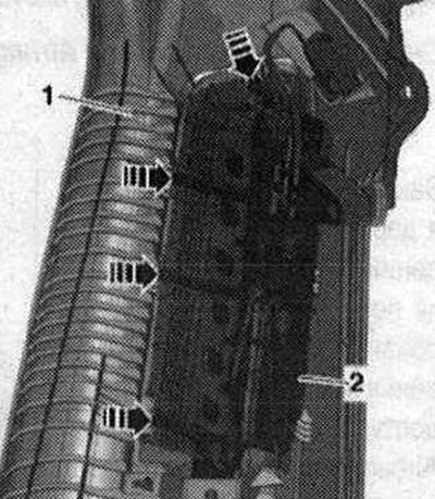 Снять заднюю накладку порога. Сжать фиксаторы боковой Airbag «стрелки» и одновременно отжать боковую Airbag «2» вперед из накладки порога «1».