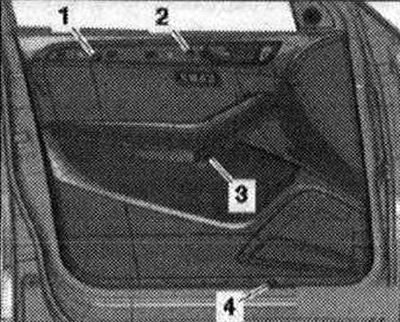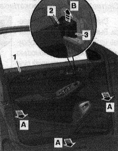 Снять обивку двери «1» по периметру по ширине примерно 15 мм с двери «стрелки А». Зажимы больше не закреплены в двери. Выдавить внутреннюю ручку двери «2» в показанном месте с обивкой двери вверх из зажима «3» «стрелка В». Отсоединить обивку двери вверху у шахты стекла от двери и снять.