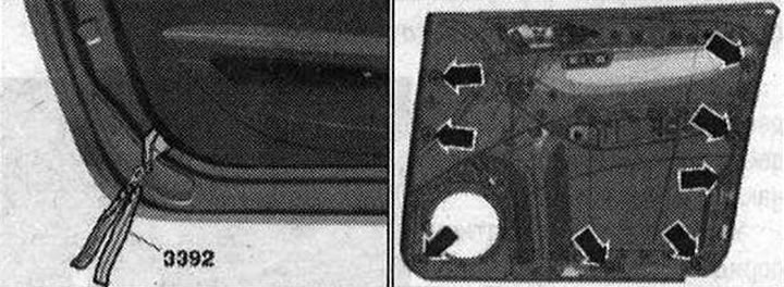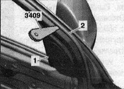 Проследить за тем, чтобы направляющая стекла не была стянута с рамы двери. Протаскивать клин «3409» между обивкой рамы окна и «1» и уплотнением двери «2» по всей длине и одновременно прижимать обивку к раме двери.