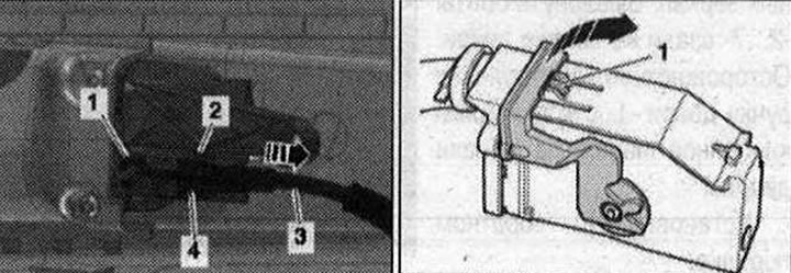 Осторожно отсоединить скобу «4» от опоры троса «2». Извлечь трос «3» внутреннего привода двери в «направлении стрелки» из опоры троса. Отсоединить конец тяги «1» к внутреннему приводу двери.