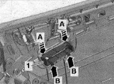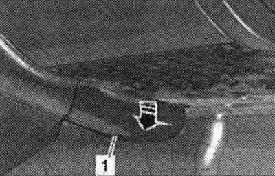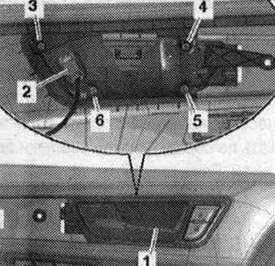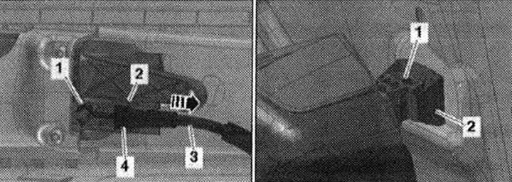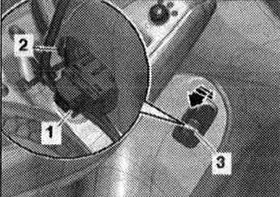 Снять обивку передней двери на стороне водителя. Отсоединить штекерный разъем «1» с выключателя дистанционного отпирания крышки багажника. Расфиксировать зажим «2» и выдавить накладку «3» с выключателем дистанционного отпирания крышки багажника из обивки двери «стрелка».