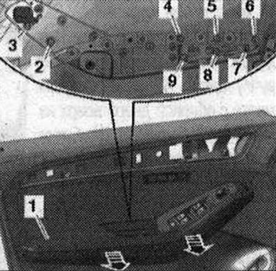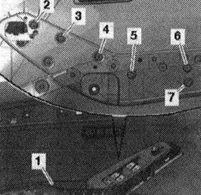 Снять панель управления стеклоподъемника. Дверь водителя: снять переключатель регулятора положения наружных зеркал. Вывернуть болты «2...7» сзади на обивке двери. Осторожно снять внутреннюю ручку двери «1» с креплением кнопочной панели с обивки двери.
