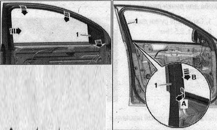 Вставить обшивку «1» рамы стекла, начав с заднего конца внутрь «стрелка», в направляющей стекла «2».