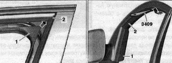 Накрыть обивкой «1» рамы стекла с помощью клина «3409» направляющую стекла «2» «стрелка»