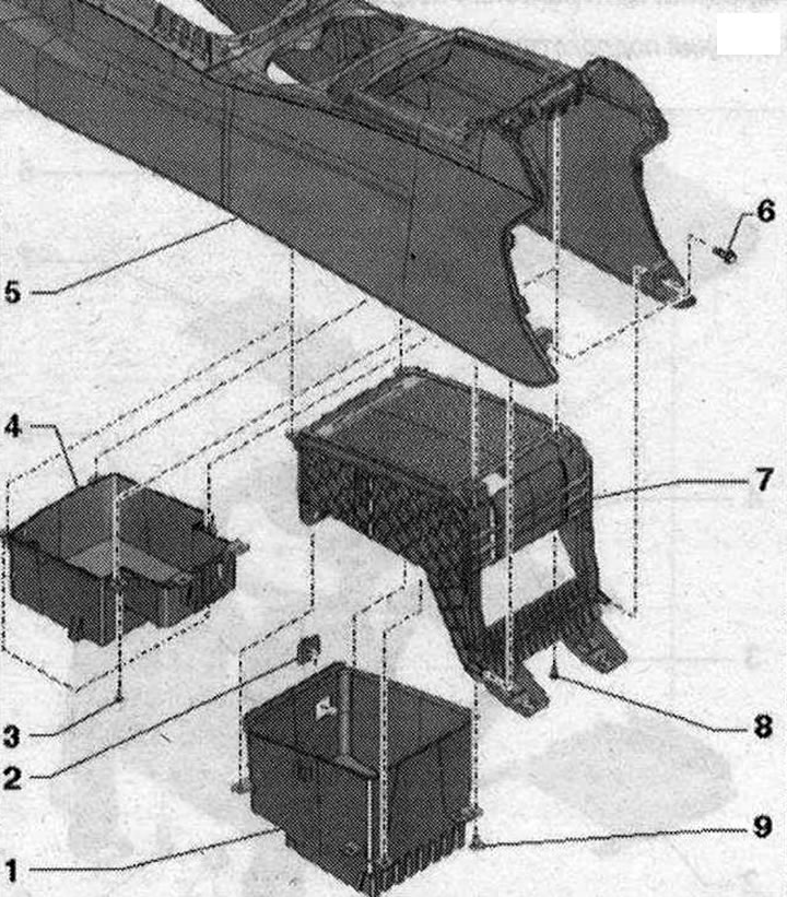 I 1. Вещевой отсек; 2. Крышка/Вывод AUX 3/8/9. Болт. 4 шт. 1,4 Н·м; 4. Вещевой отсек; 5. Центральная консоль; 6. Болт. 2 шт. 3 Н·м; 7. Крышка-жалюзи