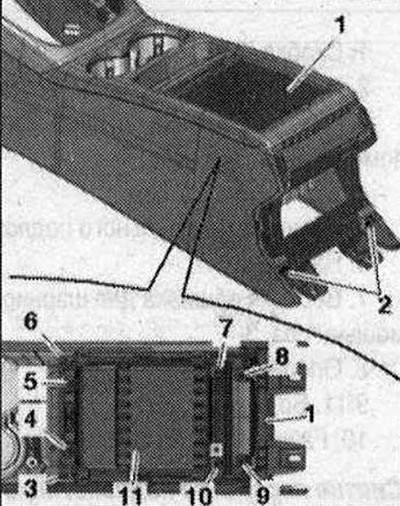 Снять центральную консоль. Выкрутить болты «2». Повернуть центральную консоль. Вывернуть болты «3...10» и снять вещевой отсек «11». Вариант компл. с телефоном/ мобильным телефоном: снять телефон/ мобильный телефон. Извлечь крышку-жалюзи «1» из центральной консоли.