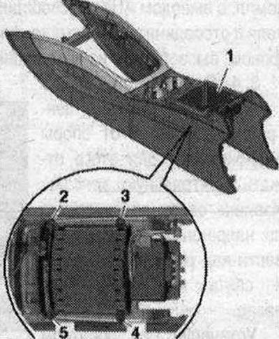 Снять центральную консоль. Повернуть центральную консоль. Вывернуть болты «2...5» и снять вещевой отсек «1». Вариант компл. с телефоном/ мобильным телефоном: снять телефон/ мобильный телефон.