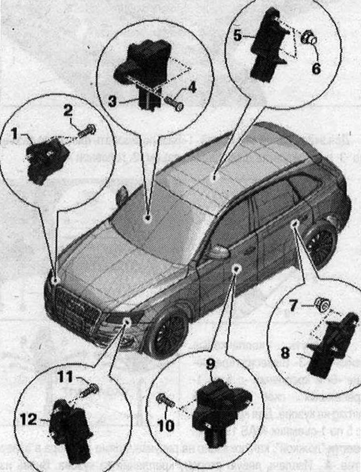 Детали и узлы датчиков удара для Airbag 1. Датчик удара фронтальной подушки переднего пассажира «G284». Место установки:' на кронштейне корпуса фар3. Датчик удара боковой Airbag со стороны переднего пассажира «G180». Место установки: в двери. Меры предосторожности при работе с датчиками удара (датчики давления) передней боковой Airbag; 4/10. Болт. 2 шт. 5 Н·м; 5. Датчик удара задней боковой Airbag со стороны переднего пассажира «G257». Место установки: на колесной нише изнутри за накладкой порога; 8. Датчик удара задней боковой Airbag со стороны водителя «G256». Место установки: на колесной нише изнутри за накладкой порога; 9. Датчик удара боковой Airbag со стороны водителя «G179». Место установки: в двери. Меры предосторожности при работе с датчиками удара (датчики давления) передней боковой Airbag; 12. Датчик удара фронтальной подушки водителя «G283». Место установки: на кронштейне корпуса фар