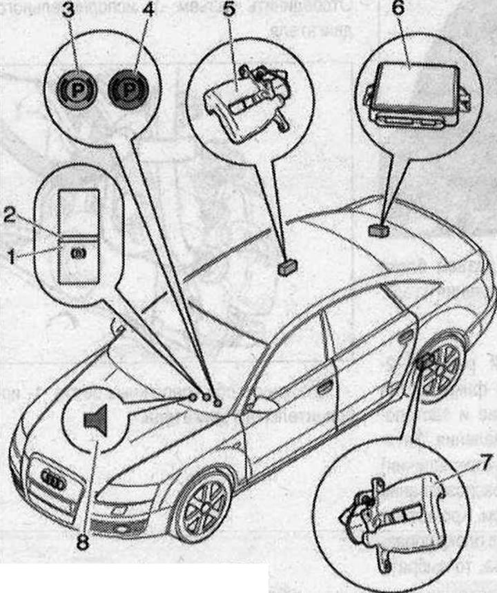 Эл. стояночный тормоз (ЕРВ) 1. Выключатель стояночного тормоза «F321». Выключатель горит длительное время, чтобы его было легче найти в темноте. Нажатие на себя - закрытие "затянуть ручной тормоз". Нажатие кнопки открывание, необходимо нажатие ножного тормоза. Место расположения: на центральной консоли; 2. Светодиод (Light «Emitting» Diode). Место установки: в выключателе стояночного тормоза. Горит при включенном стояночном тормозе. Дополнительная индикация за счет контрольной лампы в комбинации приборов. При динамическом замедлении свыше 7 км/ч линейный индикатор выключателя загорается красным цветом. Дополнительно раздается звуковой сигнал; 3. Лампа неисправности системы ЕРВ (желтая). При нарушении функционирования стояночного тормоза на дисплее комбинации приборов дополнительно появляется символ желтого цвета и предупреждение водителю: Стояночный тормоз!; 4. Контрольная лампа электромеханического стояночного тормоза. Лампа горит красным цветом: индикация при достижении силы прижатия колодки. При включенном стояночном тормозе и включенном зажигании горит контрольная лампа. После выключения зажигания контрольная лампа горит еще прибл. 20 секунд. Если стояночный тормоз включен при выключенном зажигании, контрольная лампа загорается прибл. на 20 секунд. Контрольная лампочка гаснет при выключенном стояночном тормозе. Лампа мигает красным цветом: если после включения стояночного тормоза контрольная лампа горит красным цветом, то это может означать следующее: тормозная сила стояночного тормоза недостаточна для того, чтобы зафиксировать а/м от скатывания; слишком высокая температура тормоза. Если контрольная лампа мигает красным цветом, то а/м следует зафиксировать от скатывания другим способом. Лампа горит зеленым цветом, контрольная лампа при включенном ассистенте трогания на подъеме (АНА). Дополнительно желтая лампа: при нарушении функционирования стояночного тормоза на дисплее комбинации приборов дополнительно появляется символ желтого цвета и предупреждение водителю: Стояночный тормоз!; 5, Исполн. серводвигатель эл. стояночного тормоза с правым тормозным суппортом; 6. Б/у эл. стояночного и ручного тормоза «J540». Место установки: за обивкой боковины сзади справа. 9 Н·м; 7. Исполн. серводвигатель эл. стояночного тормоза с левым тормозным суппортом; 8. Звуковой сигнал. Предупреждение при приведении в действие во время движения со скоростью более 7 км/ч.