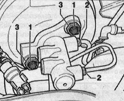 Установка в обратном порядке. Установить новое уплотн. кольцо между главным тормозным цилиндром и усилителем тормозов. При установке главного торм.цилиндра следить за правильным положением нажимной штанги в усилителе тормозов. Слегка нажать на педаль тормоза, за счет этого облегчается установка нажимной штанги в главный торм. цилиндр. Ввернуть и затянуть новые гайки «3». Соблюдать момент затяжки. Привернуть торм. магистрали «2» к главному цилиндру. Соблюдать момент затяжки. Установить бачок с торм. жидкостью «1».