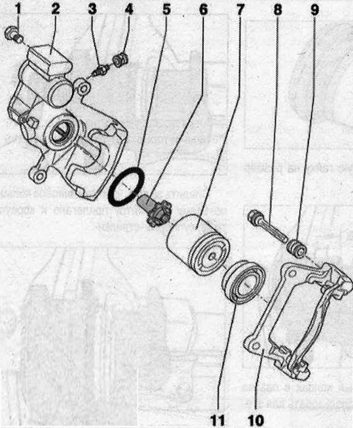 Перед установкой направляющего пальца нанести на него смазку. Надеть защитный колпачок на канавку направляющего пальца. Провести направляющий палец «8» вместе с защитным колпачком «9» через кронштейн тормоза. Надеть защитный колпачок на канавку кронштейна тормоза. Вставить торм. суппорт. Ввернуть и затянуть болты «1».