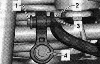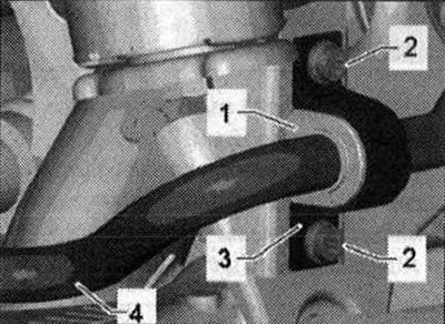 Установить а/м на подъемник. Снять колеса. При снятии и установке не повредить краску стабилизатора. В зависимости от типа двигателя снять задний глушитель системы выпуска ОГ. Вывернуть болт «4» слева и справа. Стабилизатор «4» снимается и устанавливается в комплекте с резиновыми опорами «1» и хомутами «3». Хомуты и резиновые опоры не снимать. Вывернуть болты «2» слева и справа и снять стабилизатор «4» с соединительными тягами.