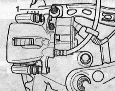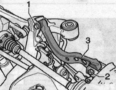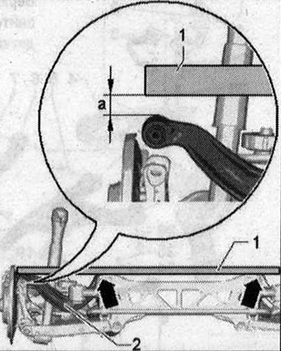Из-за недоступности внутреннего резьбового соединения «1» поперечный рычаг можно снять только при снятом подрамнике. Перед началом работ измерить расстояние «а» от середины колеса до нижней кромки колесной ниши, пока колеса еще не сняты с а/м. Установить а/м на подъемник. Снять колеса. Снять подрамник. Отметить, например фломастером, положение эксцентрикового болта «2» относительно корпуса подшипника колеса. Разъединить винтовые соединения «1» и «2». Снять верхний поперечный рычаг «3».