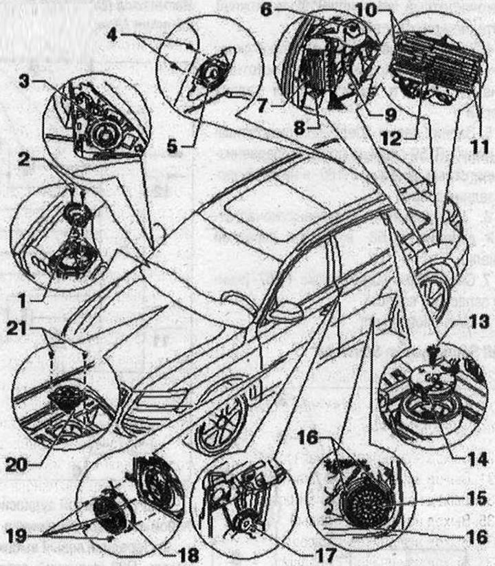 Схема монтажа Premium (Bang&Olufsen) 1. Передний левый среднечастотный динамик «R103» /передний правый среднечастотный динамик «R104»; 2/21. Болт. 1 Н·м; 3. Передний левый высокочастотный динамик «Н20» /передний правый высокочастотный динамик «R22»; 4/13. Болт. 2 Н·м; 5. Задний левый среднечастотный динамик «R105» /задний правый среднечастотный динамик «R106»; 6/8/9/16/19. Гайка. 3 Н·м; 7/12. Б/у цифрового акустического пакета «J525»; 10/11. Болт. 3,5 Н·м; 14. Сабвуфер в задней полке «R157»; 15. Задний левый динамик средней и низкой частоты «Н159» /задний правый динамик средней и низкой частоты «R160»; 17. Задний левый высокочастотный динамик «И14» /задний правый высокочастотный динамик «Rie»; 18. Передний левый низкочастотный динамик «R21» /передний правый низкочастотный динамик «R23»; 20. Центральный средне- и высокочастотный динамик «R158»