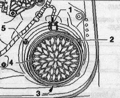 Задний левый средненизкочастотный динамик «Р159» /задний правый средненизкочастотный динамик «Р160» находятся в нижней части задних дверей. Порядок снятия и установки идентичен. Выключить все эл. потребители. Выключить зажигание. Снять обшивку задней двери. Отсоединить разъем «1» от заднего левого динамика средних и низких частот «Р159» «4». Отвернуть болты «2», «3» и «5» снять задний левый средненизкочастотный динамик «Р159» «4».