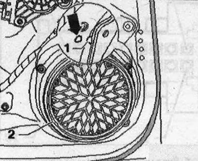 Установка в обратном порядке. При этом необходимо, чтобы штифты «1» заднего левого среднечастотного динамика Р159- «2» правильно зафиксировались в отверстиях «стрелка» слева и справа под резьбовыми отверстиями.