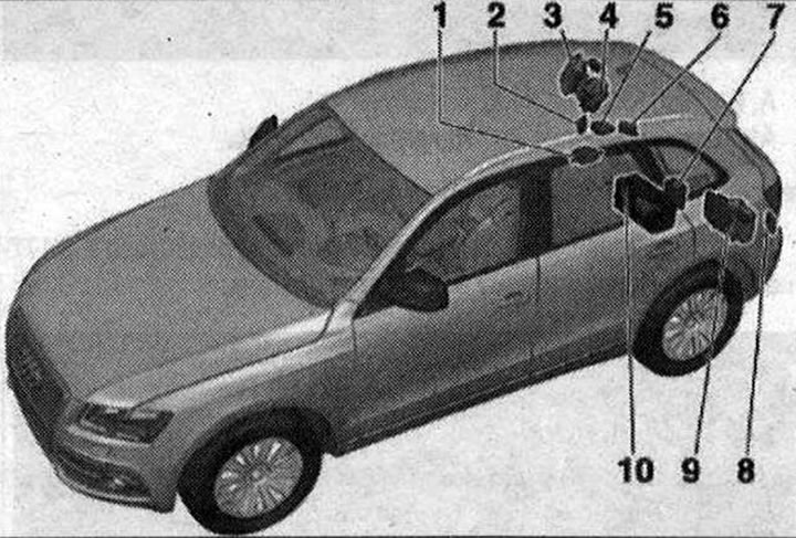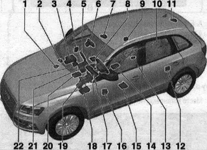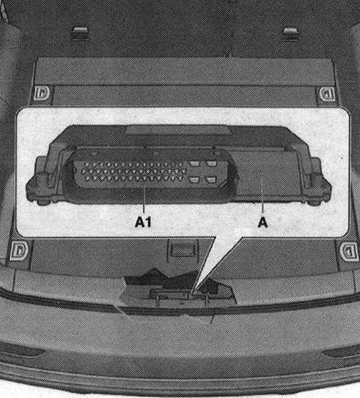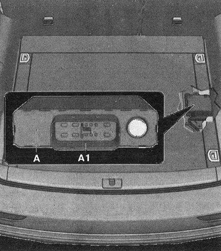 1. Стабилизатор напряжения «J532»; 2. Б/у парковочного автопилота «J791»; место установки: в багажнике справа, за боковой обшивкой; 3. Б/у распознавания прицепа «J345»; место установки: в багажнике справа, за боковой обшивкой; 3. Б/у электронной системы регулировки жесткости амортизаторов «J250»; место установки: в багажнике справа, за боковой обшивкой; 3. Усилитель моб. телефона «R86»; место установки: в багажнике справа, за боковой обшивкой; 3. Приемник автономного отопителя «R64»; место установки: в багажнике справа, за боковой обшивкой; 4. Центральный блок управления систем комфорта «J393»; место установки: в багажнике справа, за боковой обшивкой; 5. Б/у электромеханического стояночного тормоза «J540»; место установки: в багажнике справа, за боковой обшивкой; 6. Б/у 2 ассистента смены полосы движения «J770» : место установки: на внутренней стороне заднего бампера; 7. Б/у системы полного привода «J492»; 8. Б/у ассистента смены полосы движения «J769»; место установки: на внутренней стороне заднего бампера; 9. Б/у цифровой аудиосистемы «J525»; место установки: в багажнике слева, за боковой обшивкой; 9. Магнитола «R» (коммутационный блок); место установки: в багажнике слева, за боковой обшивкой 9. Спутниковый радиоприемник «R146»; место установки: в багажнике слева, за боковой обшивкой; 9. Цифровая магнитола «R147»; место установки: в багажнике слева, за боковой обшивкой '; 9. Б/у навигационной системы с CD «приводом» J401 место установки: в багажнике слева, за боковой обшивкой; 9. ТВ-тюнер «R78»; место установки: в багажнике слева, за боковой обшивкой; 9. Б/у камеры заднего вида «J772»; место установки: в багажнике слева, за боковой обшивкой; 10. Б/у для контроля АКБ «J367»