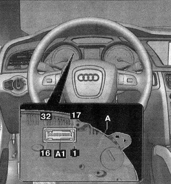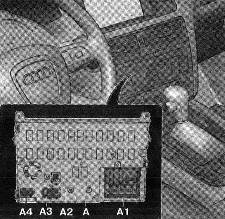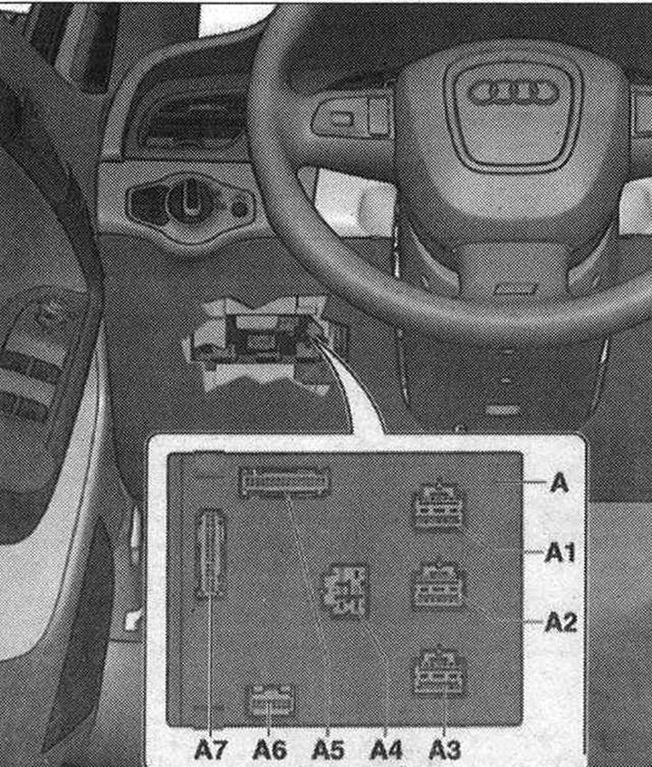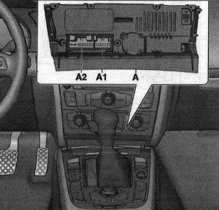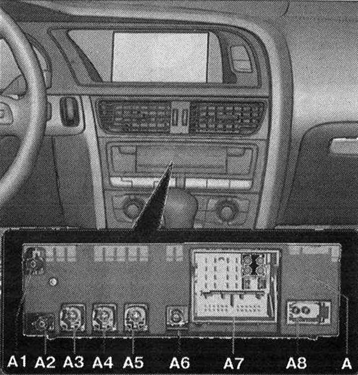 - А1. Разъемы для а/м с MMI Basic, с сентября 2009 г.: Штекерный разъем, 8-контактный, черный «T8ai», Штекерный разъем, 4-контактный, белый «Т4ао»