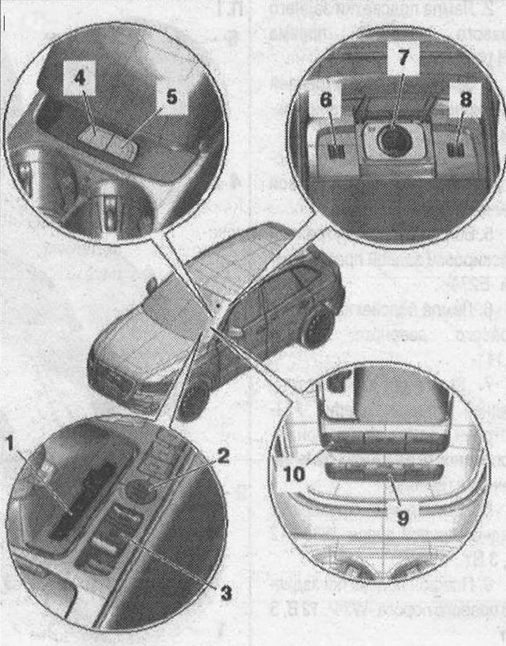 I 1. Индикатор положения селектора «Y26» с лампой подсветки шкалы селектора «L101»; 2. Кнопка управления правом доступа и запуска двигателя «Е408»; 3. Клавиша электромеханического стояночного тормоза «Е538», клавиша AUTO HOLD «Е540»; 4. Выключатель "охлаждение" подстаканника с элементом нагрева и охлаждения «Z105», может заменяться только вместе с «поз. 5»; 5. Выключатель "нагрев" подстаканника с элементом нагрева и охлаждения «Z105», может заменяться только вместе с «поз. 4»; 6. Выключатель регулировки заднего левого сиденья с подогревом «Е128»; 7. Розетка 212 В «U18» с лампой для подсветки розетки «L42»; 8. Выключатель регулировки заднего правого сиденья с подогревом «Е129»; 9. Блок выключателей для Charisma «Е592» (только при компл. MMi-Basis); 10. Клавиатура (только при компл. MMi-Basis) в зависимости от компл., с выключателем шторки заднего стекла «Е149», клавишей для ASR и ESP «Е256», клавишей для парковочного ассистента «Е266»