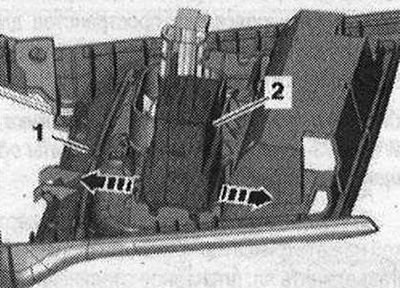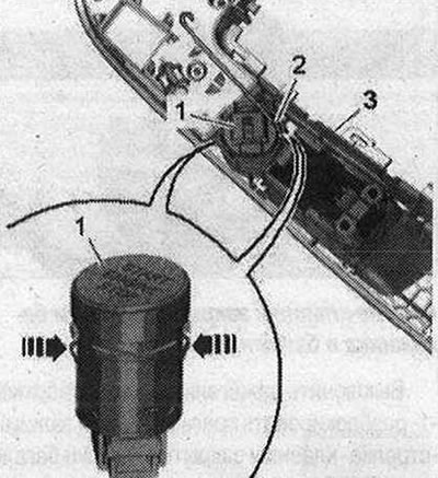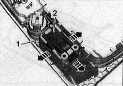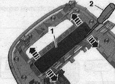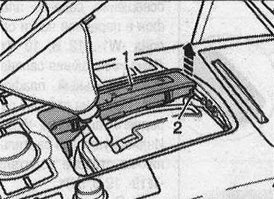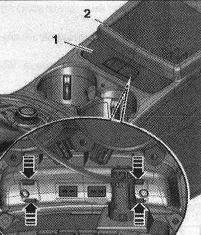 Выключить зажигание. Снятие подстаканника с элементом нагрева и охлаждения. Осторожно сжать фиксаторы «стрелки» и извлечь заглушку «1» с выключателем из центральной консоли «2».