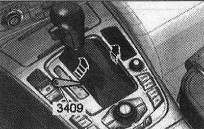 Потянуть клавишу стояночного тормоза для включения электромеханического стояночного тормоза. Перевести рычаг селектора в положение "S". Выключить зажигание. Осторожно поддеть в сторону манжету селектора передач клином «3409» или маленькой отверткой «стрелки». Переместить манжету рычага селектора КПП вверх.