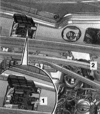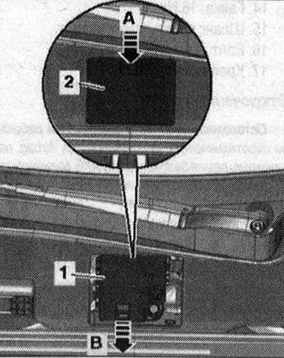 Выключить зажигание и все потребители электроэнергии, извлечь ключ зажигания. Разблокировать и снять крышку «2», нажав на место, обозначенное «стрелкой А». Разблокировать фиксатор «стрелка В» и открыть крышку «1».